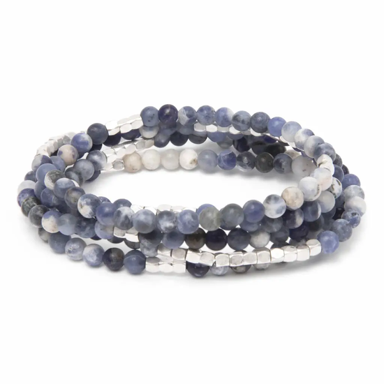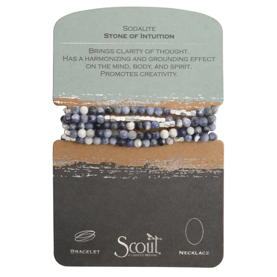 BRACELET BECOMES A NECKLACE & TA-DA! TAP INTO THE ENERGIES OF THE EARTH. SEMI PRECIOUS GEMSTONES ADORN WRIST & NECKLINE. EFFORTLESSLY CONVERTS FROM BRACELET TO NECKLACE. CAN BE WRAPPED 4-5 TIMES AS A BRACELET AND 1-2 TIMES AS A NECKLACE. • 34" LENGTH • MATERIALS: 4.5MM SEMI PRECIOUS STONE BEADS, PLATED BRASS, STRETCH CORD • PRESENTED ON CARDS THAT TELL THE MEANING OF EACH STONE SODALITE | STONE OF INTUITION. BRINGS CLARITY OF THOUGHT. HAS A HARMONIZING AND GROUNDING EFFECT ON THE MIND, BODY, AND SPIRIT. PROMOTES CREATIVITY.