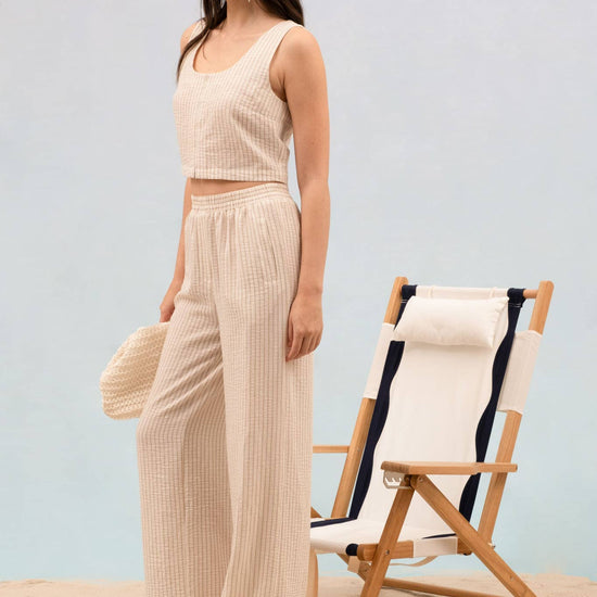 TOP: SCOOP NECKLINE SLEEVELESS SPLIT HEM STRIPE PATTERN CROPPED TANK TOP BOTTOM: HIGH WAIST ELASTIC WAIST POCKETS WIDE LEG STRIPE PATTERN NOT LINED LOUNGE PANTS 100% POLYESTER