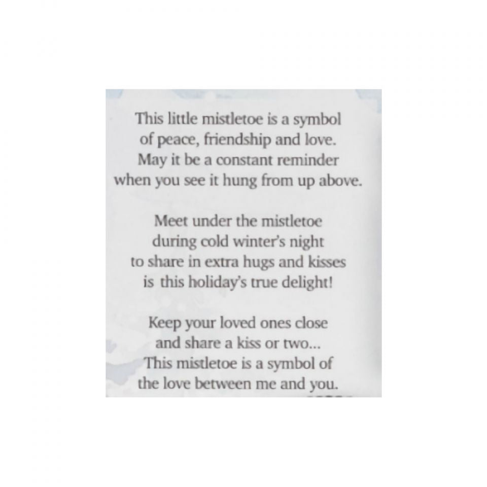 THE GANZ MERRY MISTLETOE CHARM COMES WITH A CARD THAT READS "THIS LITTLE MISTLETOE IS A SYMBOL OF PEACE, FRIENDSHIP AND LOVE. MAY IT BE A CONSTAND REMINDER WHEN YOU SEE IT HUNG FROM UP ABOVE. MEET UNDER THE MISTLETOE DURING COLD WINTER'S NIGHT TO SHARE IN EXTRA HUGS AND KISSES IS THIS HOLIDAY'S TRUE DELIGHT! KEEP YOUR LOVED ONES CLOSE AND SHARE A KISS OR TWO... THIS MISTLETOE IS A SYMBOL OF THE LOVE BETWEEN ME AND YOU."