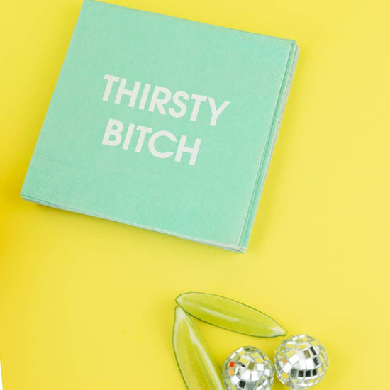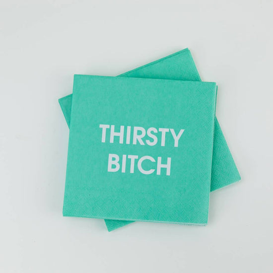 GET THE CONVERSATIONS GOING WITH THE CHEZ GAGNÉ PAPER COCKTAIL NAPKINS. THESE BABES ARE THE PERFECT ADDITION TO ANY PARTY OR SOIREE AND ARE SURE TO GET SOME LAUGHS. NAPKIN COLOR: TEAL 3 PLY PAPER COCKTAIL NAPKINS SET OF 20 NAPKINS SIZE: 5 X 5 IN, 10 X 10 IN WHEN UNFOLDED PRINTING: WHITE MADE IN GERMANY ENVIRONMENTALLY FRIENDLY, WATER-BASED COLORS, BLEACHED WITHOUT CHLORINE. BIODEGRADABLE. WARNING: COLORS MAY TRANSFER WHEN WET.