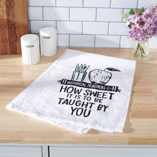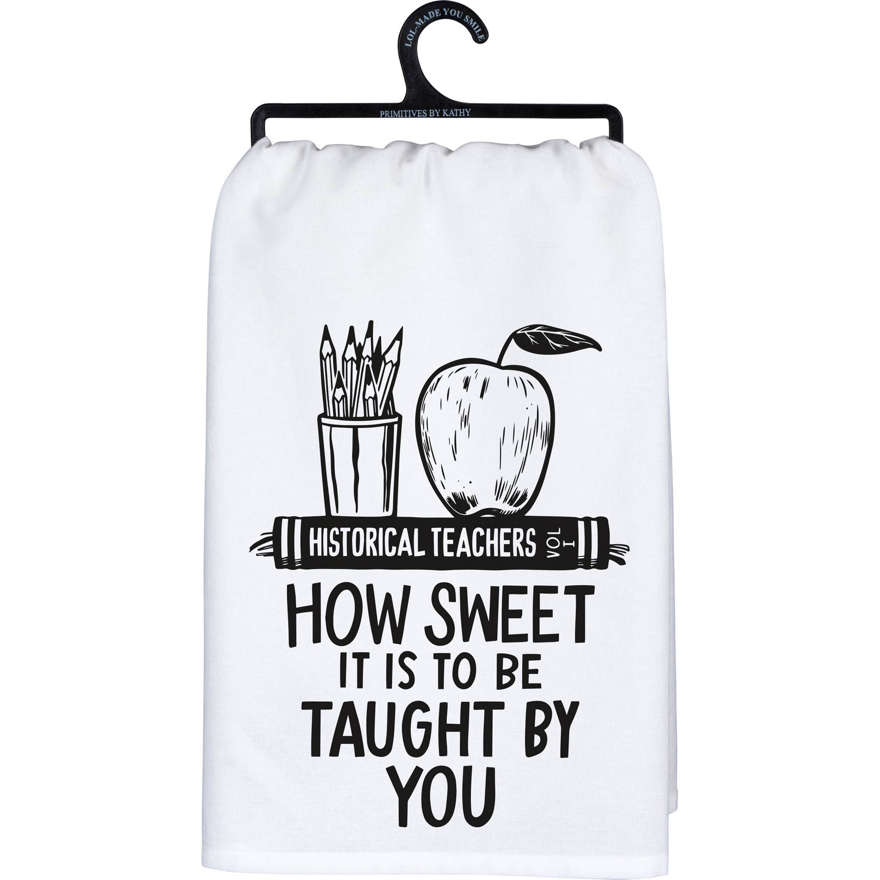 A BLACK AND WHITE COTTON KITCHEN TOWEL FROM OUR TEACHER COLLECTION DISPLAYING A FUN HAND ILLUSTRATED DESIGN OF APPLE AND PENCIL HOLDER ON TOP OF A BOOK TITLED "HISTORICAL TEACHERS VOL I" WITH SENTIMENT THAT READS "HOW SWEET IT IS TO BE TAUGHT BY YOU." OUR TO BE TAUGHT BY YOU KITCHEN TOWEL IS MACHINE-WASHABLE FOR CONVENIENT CLEANING. PACKAGED ON A BLACK PLASTIC HANGER WITH HOOK TO EASILY HANG ON RACK.