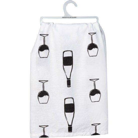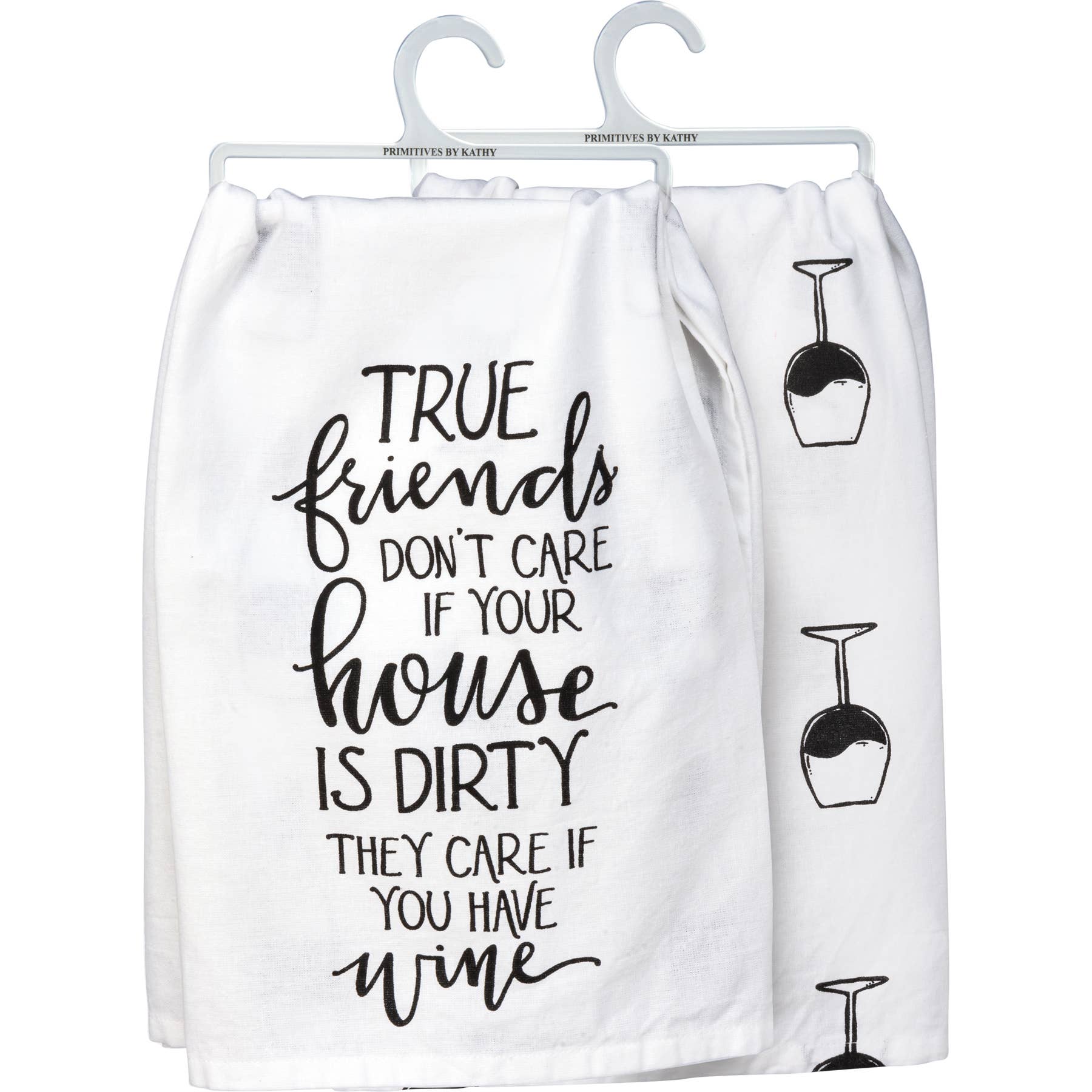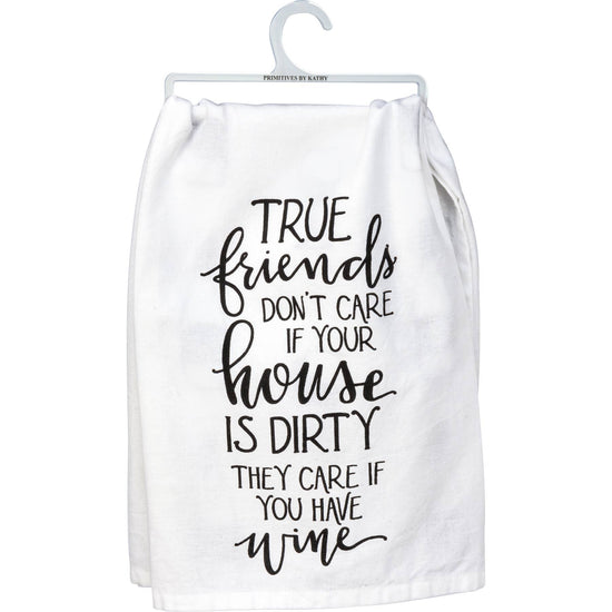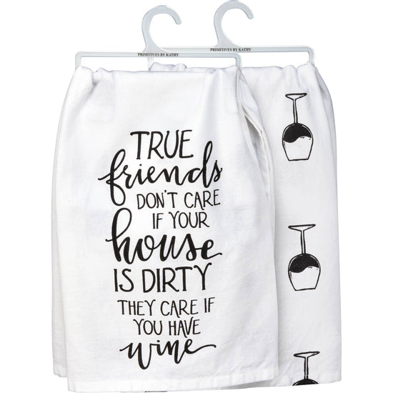 A WHITE COTTON KITCHEN TOWEL FEATURING A HAND LETTERED "TRUE FRIENDS DON'T CARE IF YOUR HOUSE IS DIRTY THEY CARE IF YOU HAVE WINE" SENTIMENT AND AN ALL-OVER PRINT DESIGN. MACHINE-WASHABLE.