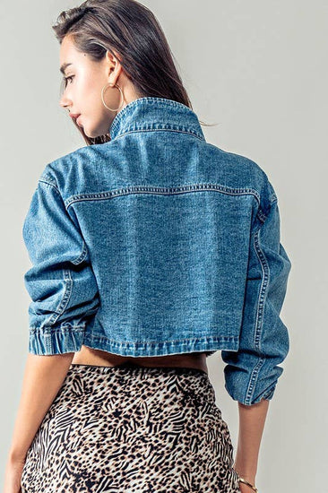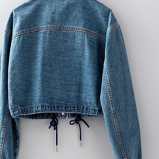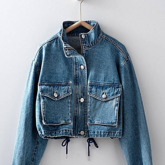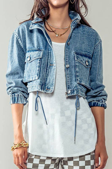 ELEVATE YOUR CASUAL WARDROBE WITH THIS MODERN UTILITY-INSPIRED DENIM JACKET FEATURING A TRENDY CROPPED SILHOUETTE. THIS VERSATILE PIECE SHOWCASES FUNCTIONAL FLAP POCKETS, A STAND COLLAR, AND AN ADJUSTABLE DRAWSTRING HEM FOR A CUSTOMIZABLE FIT. KEY FEATURES: • 100% COTTON • SIZE RATIO: S-L : 2-2-2 • STAND COLLAR DESIGN • TWO FUNCTIONAL FLAP POCKETS • SILVER-TONE BUTTON CLOSURES • ADJUSTABLE DRAWSTRING HEM • LONG SLEEVES WITH CUFFED ENDS • MADE IN CHINA • MODEL IS 5'9" WEARING SIZE SMALL COLOR MAY VARY SLIGHTLY DUE TO MONITOR RESOLUTION.