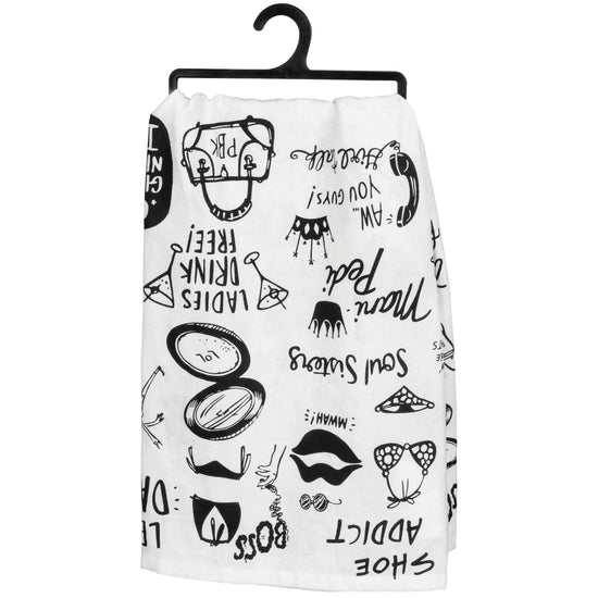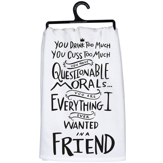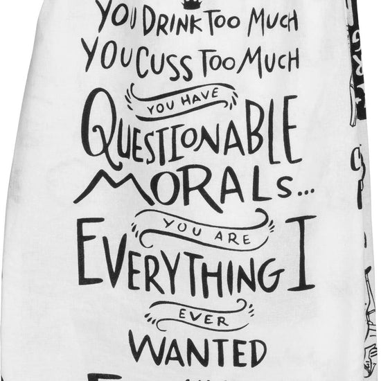 A BLACK AND WHITE COTTON KITCHEN TOWEL LENDING A "YOU DRINK TOO MUCH YOU CUSS TOO MUCH YOU HAVE QUESTIONABLE MORALS… YOU ARE EVERYTHING I EVER WANTED IN A FRIEND" SENTIMENT WITH DOZENS OF VARYING PLAYFUL DESIGNS AND CAPTIONS THROUGHOUT. MACHINE-WASHABLE.
