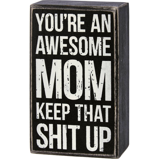 A CLASSIC BLACK AND WHITE WOODEN BOX SIGN FROM OUR MOTHER'S DAY COLLECTION DISPLAYING A DISTRESSED "YOU'RE AN AWESOME MOM KEEP THAT SHIT UP" SENTIMENT. OUR YOU'RE AN AWESOME MOM BOX SIGN IS EASY TO HANG OR CAN FREE-STAND ALONE.
